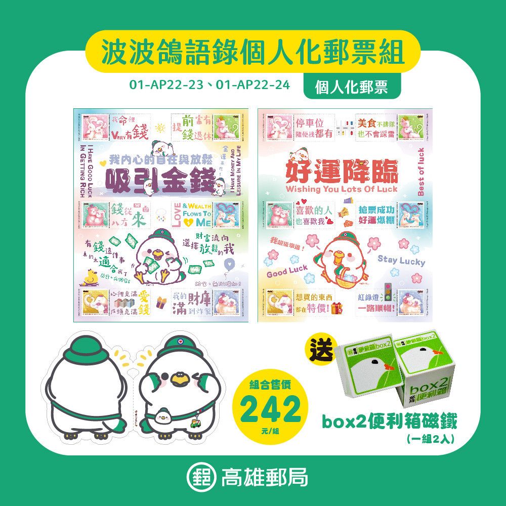 商品詳情 跟著波波鴿一起來把好運跟財富吸過來~ 每一份都有張波波鴿語錄(好運/發財)個人化郵票各一張, 以及贈送大波波鴿封套及box2便利箱磁鐵, 這麼大一份只要242元,喜歡波波鴿就不能錯過唷~ 波波鴿語錄個人化郵票組 TWD $242 TWD $242