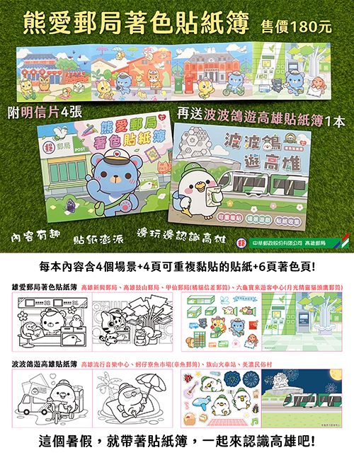 商品詳情 藉由插畫家的可愛風格呈現郵局的特色郵筒以及郵局日常, 每本含有4個場景+4頁造型貼紙+6頁著色頁, 內容豐富、精彩可愛,每本再附贈波波鴿著色貼紙簿1本+明信片4張。 高雄郵局獨家推出,要買要快喔。 熊愛郵局著色貼紙簿 TWD $180 TWD $180